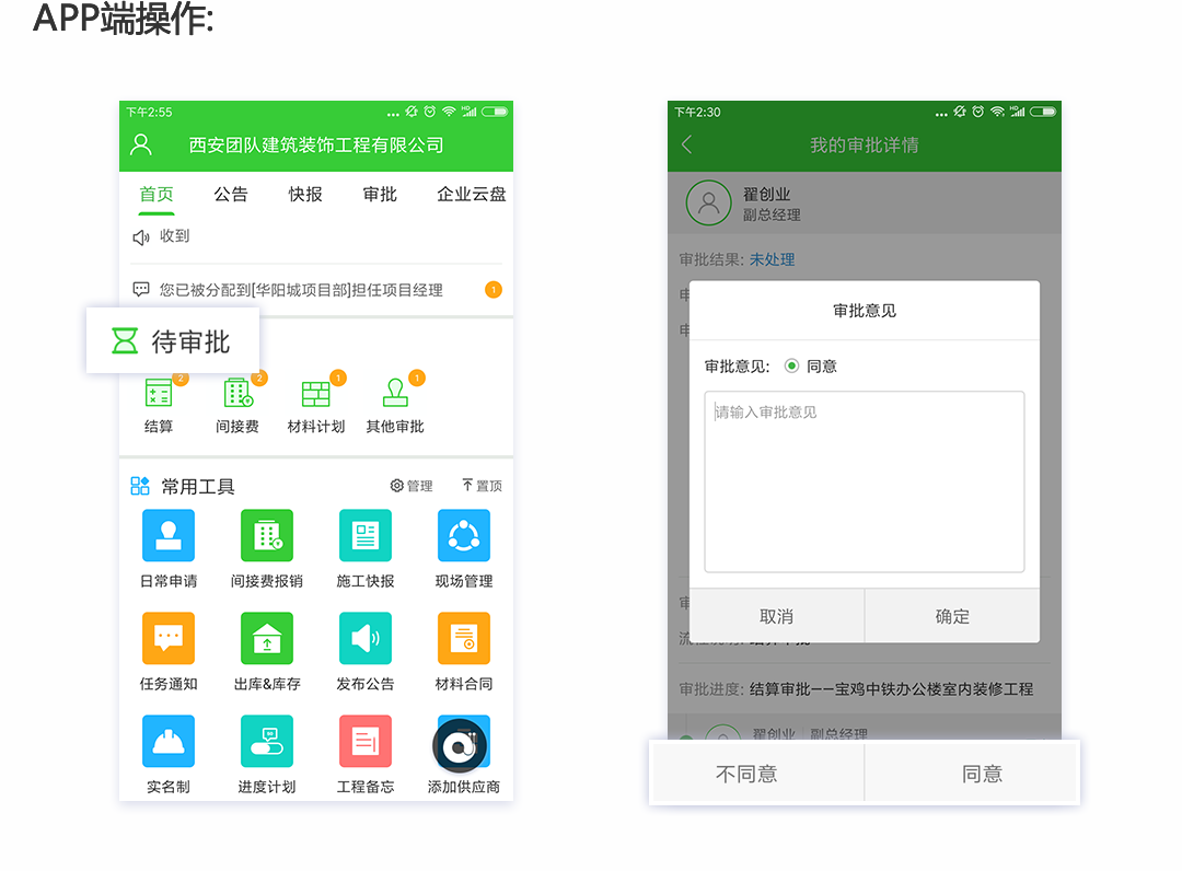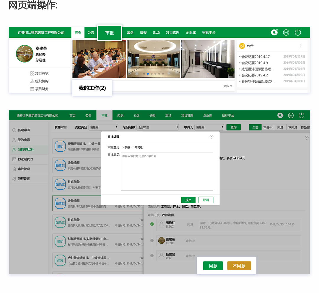 网页端“我的工作”提醒,APP端“待审批”提醒均可进入审批页面,在选择“同意/不同意”之后,审批意见为必填,防止误操作。